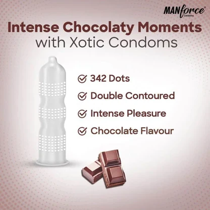 Mankind Pharma Manforce Xotic 342 Dots Chocolate Flavoured Condom (3N) is designed to provide safe sex along with enhanced pleasure. The condom features 342 stimulating dots and a double-contoured shape that increases sensation during intercourse while maintaining protection.