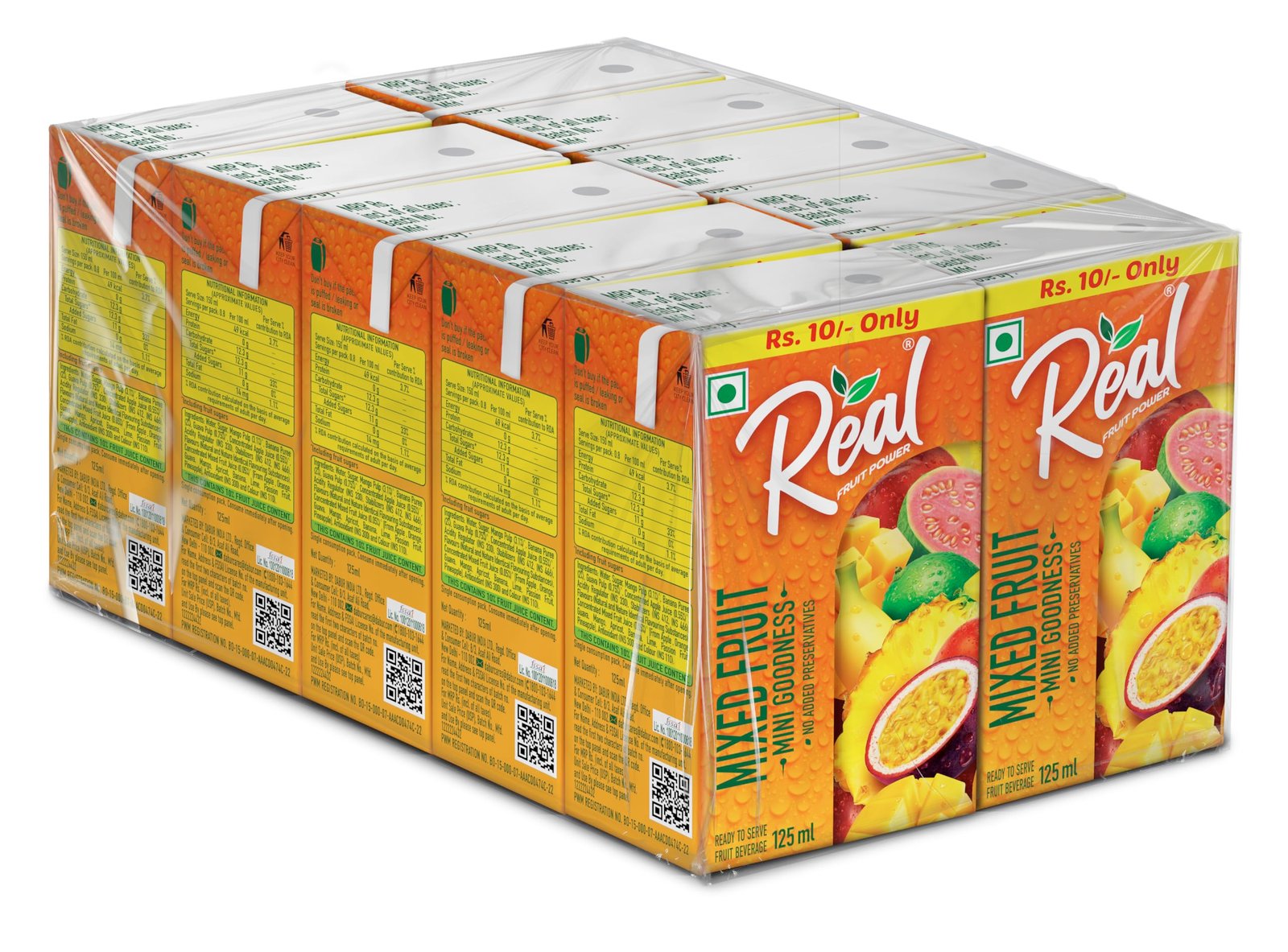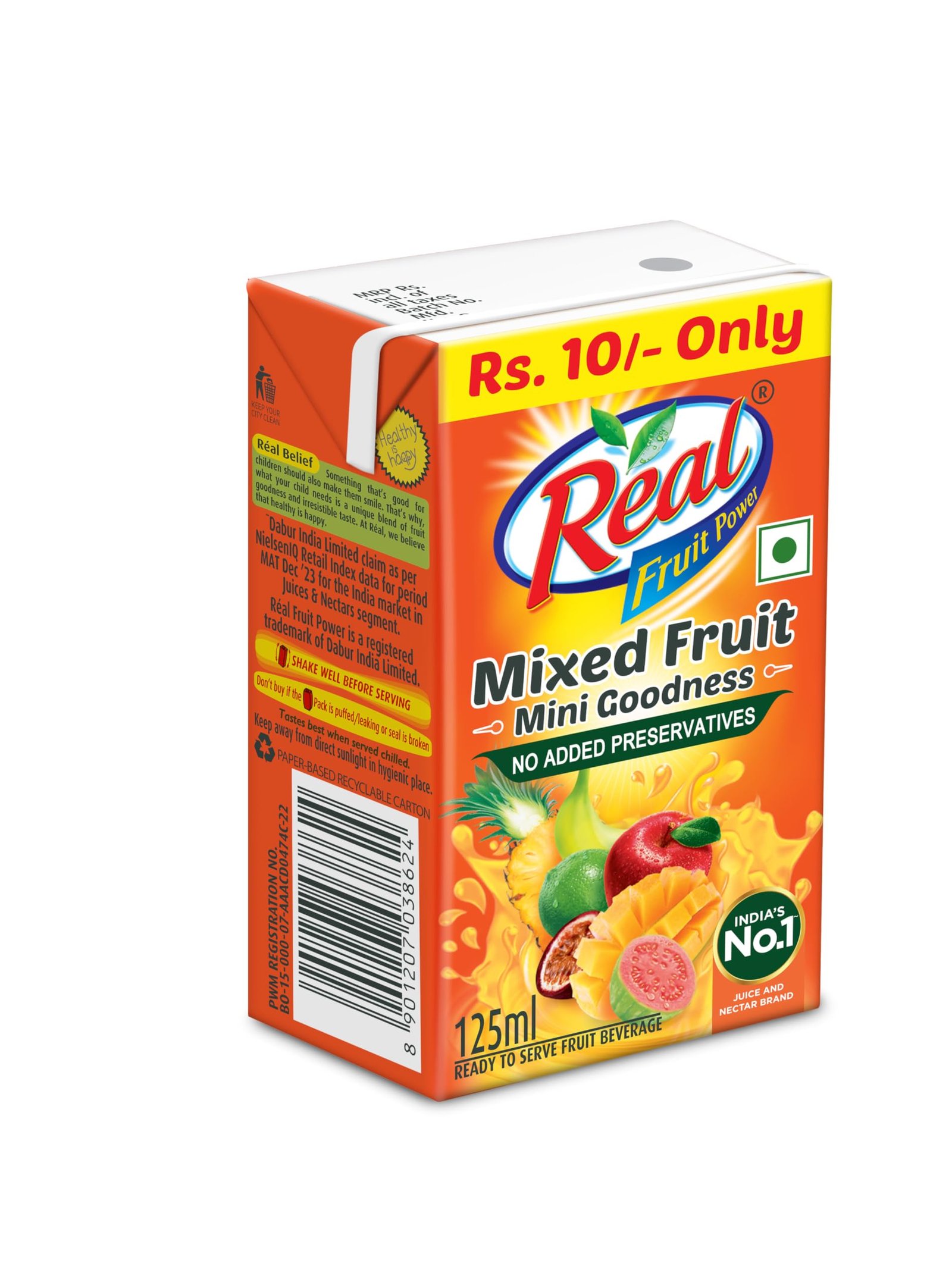 Real Mixed Fruit Juice – 125 ml is a refreshing fruit beverage made from a blend of several fruit juices, offering a naturally sweet and tangy taste. Produced by Dabur India Ltd. under the Real Fruit Power range, it is packed in a convenient Tetra Pak that keeps the juice fresh and safe to consume. It is ideal for quick refreshment, school tiffins, travel, or daily hydration.